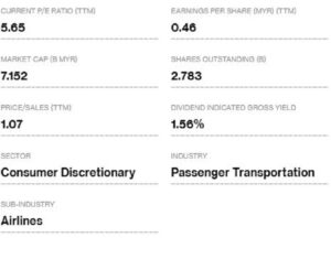 Earnings per share serves as an indicator of a company’s profitability. When a company has high EPS, it also has a high stock price. Air Asia’s EPS is MYR 0.46.