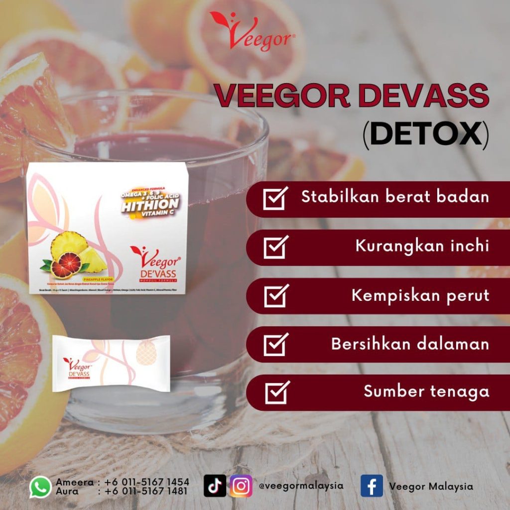 “Selain untuk cegah dan kawal obesiti, Detox Veegor diperkaya dengan tambahan vitamin-vitamin. Kami menawarkan perisa nenas dan oren kerana ia menjadi kesukaan ramai pengguna. Vitamin yang terkandung di dalamnya adalah Omega3,6,9, Vitamin C, Folik Asid, Hithion, Morosil, Mineral Premix, Vitamin Premix.