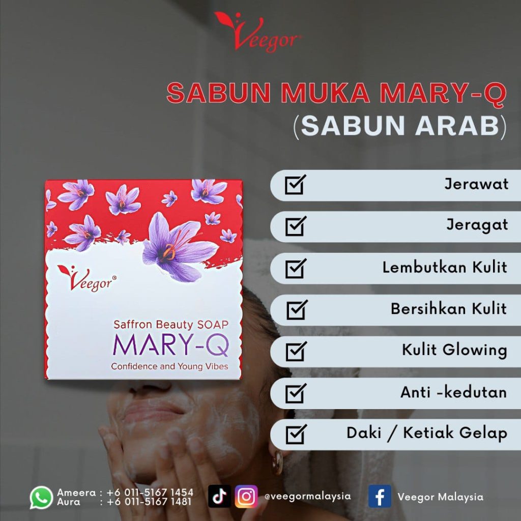 “Produk sabun MARY-Q pula dihasilkan menggunakan bahan semulajadi yang tiada bahan-bahan telarang atau kimia. Ia selamat untuk digunakan dan tidak merosakkan kulit untuk jangka masa pendek dan panjang. Sabun ini menggunakan rempah Arab dan bahan semulajadi seperti saffron, argan, minyak Zaitun dan “tea tree’’. Bahan-bahan semulajadi itu cukup untuk merawat dan memelihara muka. Sabun ini sesuai untuk menghilangkan daki-daki, kegatalan kulit, jerawat, jeragat dan melembutkan wajah,” katanya lagi.